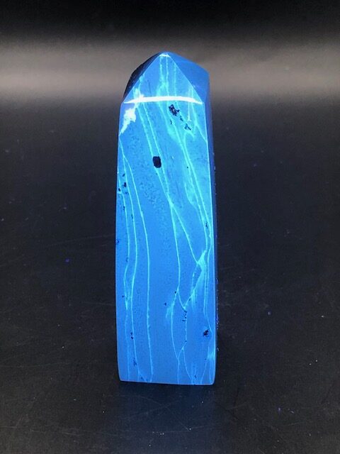 L’ambre bleu d’Indonésie est une variété d’ambre qui provient de la résine d’une espèce d’arbres désormais éteinte l’Hyménaea Protera qui vivait il y a entre 25 et 40 millions d’années. Sa fluorescence vive sous la lumière ultraviolette est due aux hydrocarbures présents dans cet dans ambre qui ont la capacité de modifier la fréquence de la lumière ultraviolette solaire, créant ainsi une charmante lueur bleue.
