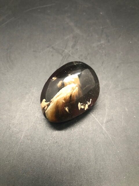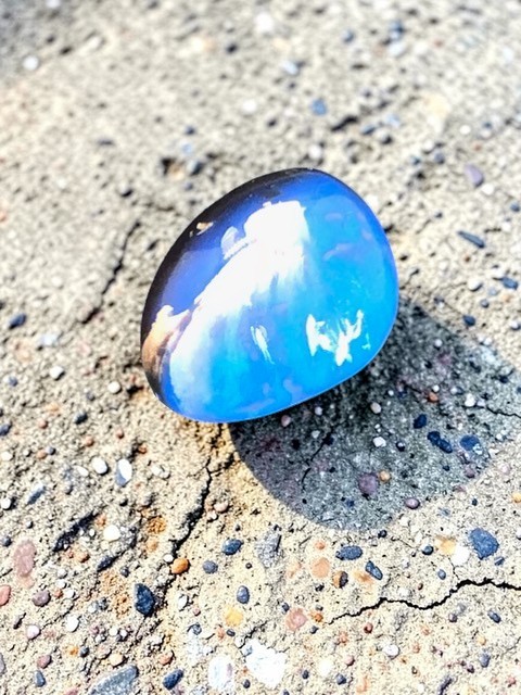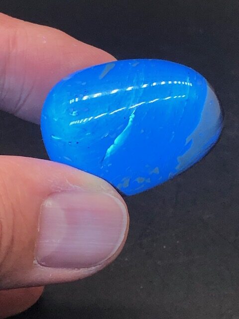 L’ambre bleu d’Indonésie est une variété d’ambre qui provient de la résine d’une espèce d’arbres désormais éteinte l’Hyménaea Protera qui vivait il y a entre 25 et 40 millions d’années. Sa fluorescence vive sous la lumière ultraviolette est due aux hydrocarbures présents dans cet dans ambre qui ont la capacité de modifier la fréquence de la lumière ultraviolette solaire, créant ainsi une charmante lueur bleue.