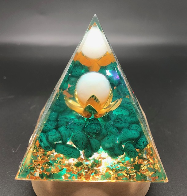 Les orgonites pyramides sont composées de cristaux, de pierres fines, de résine et de particules de métalliques.