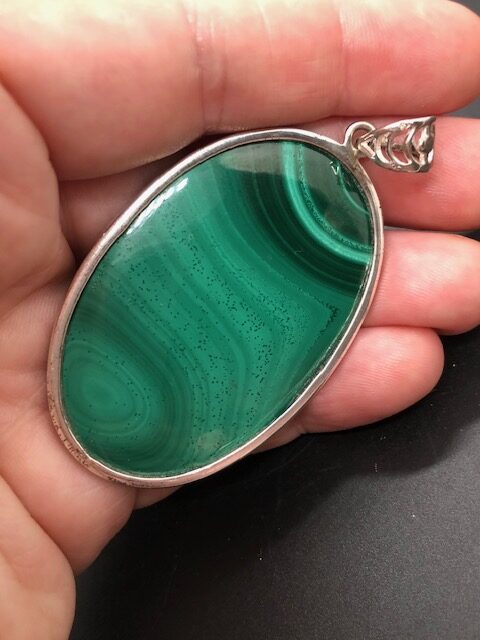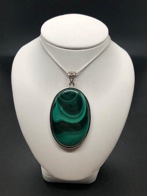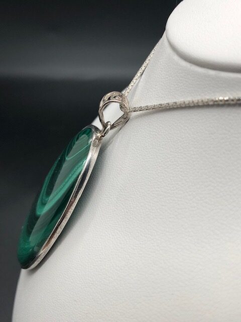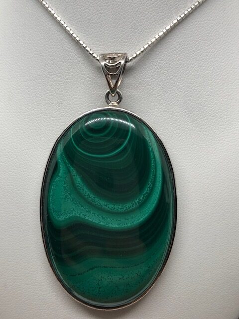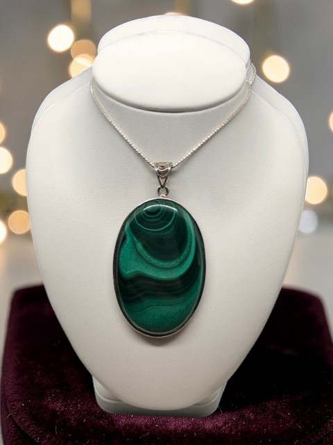 Pendentif en argent 925, pierre Malachite, chaîne en argent 925.