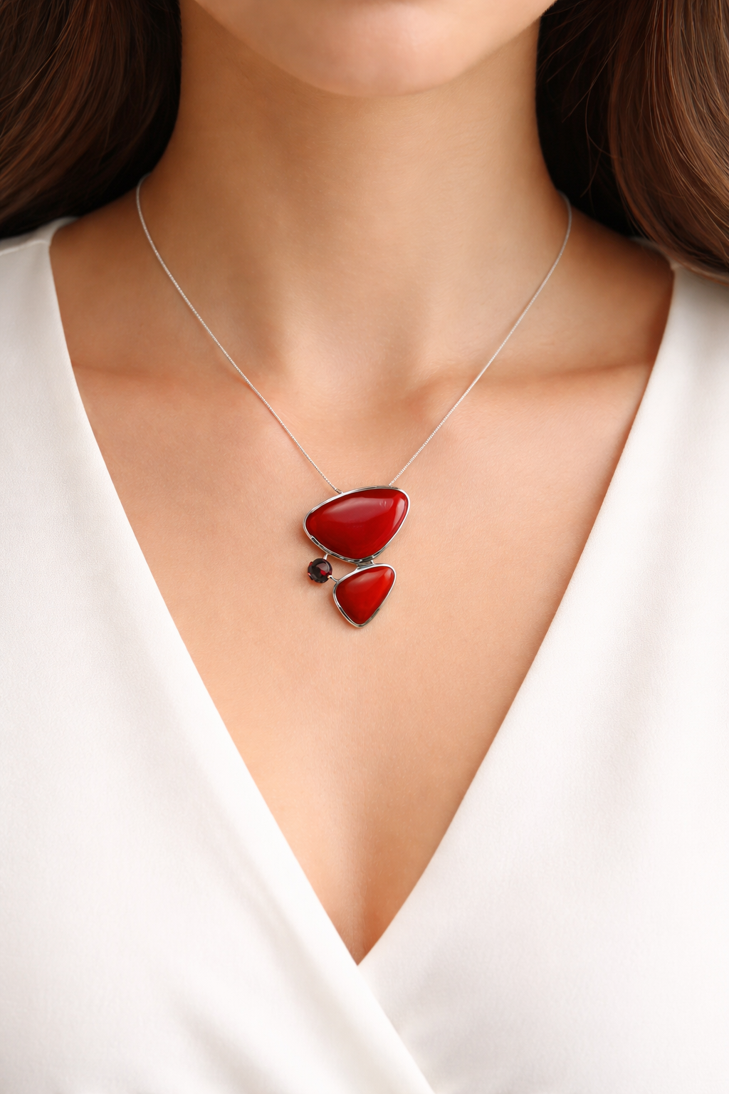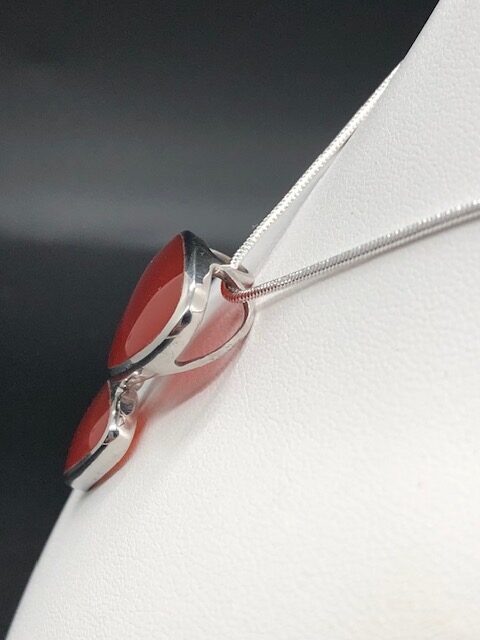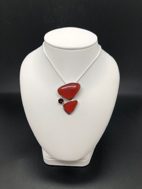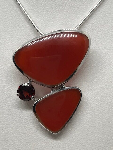 Pendentif en argent rhodié, pierres Cornaline et Grenat, chaîne en argent 925.