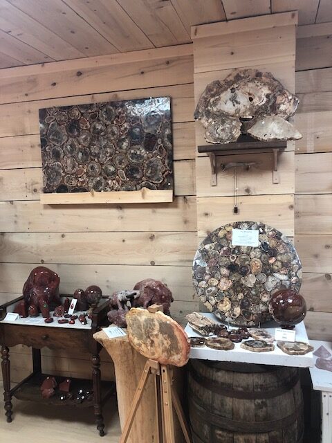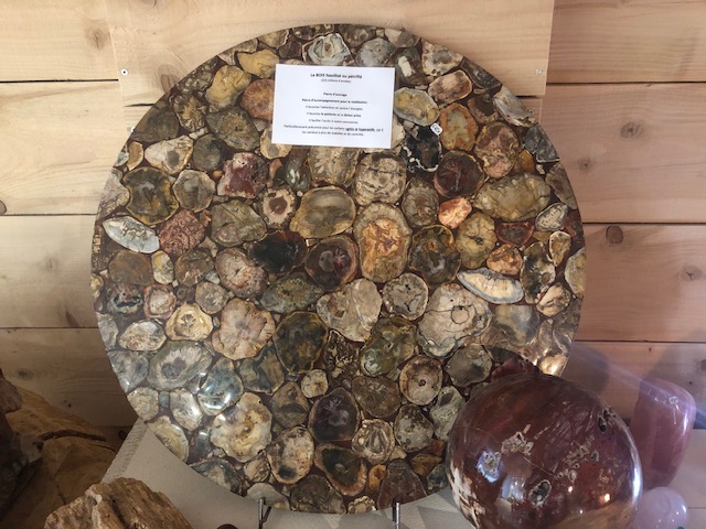 Assemblage de bois fossilisés formant un plateau pouvant être utilisé comme table ou tableau décoratif