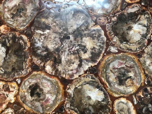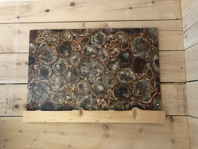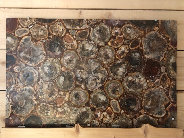 Assemblage de bois fossilisés formant un plateau pouvant être utilisé comme table ou tableau décoratif